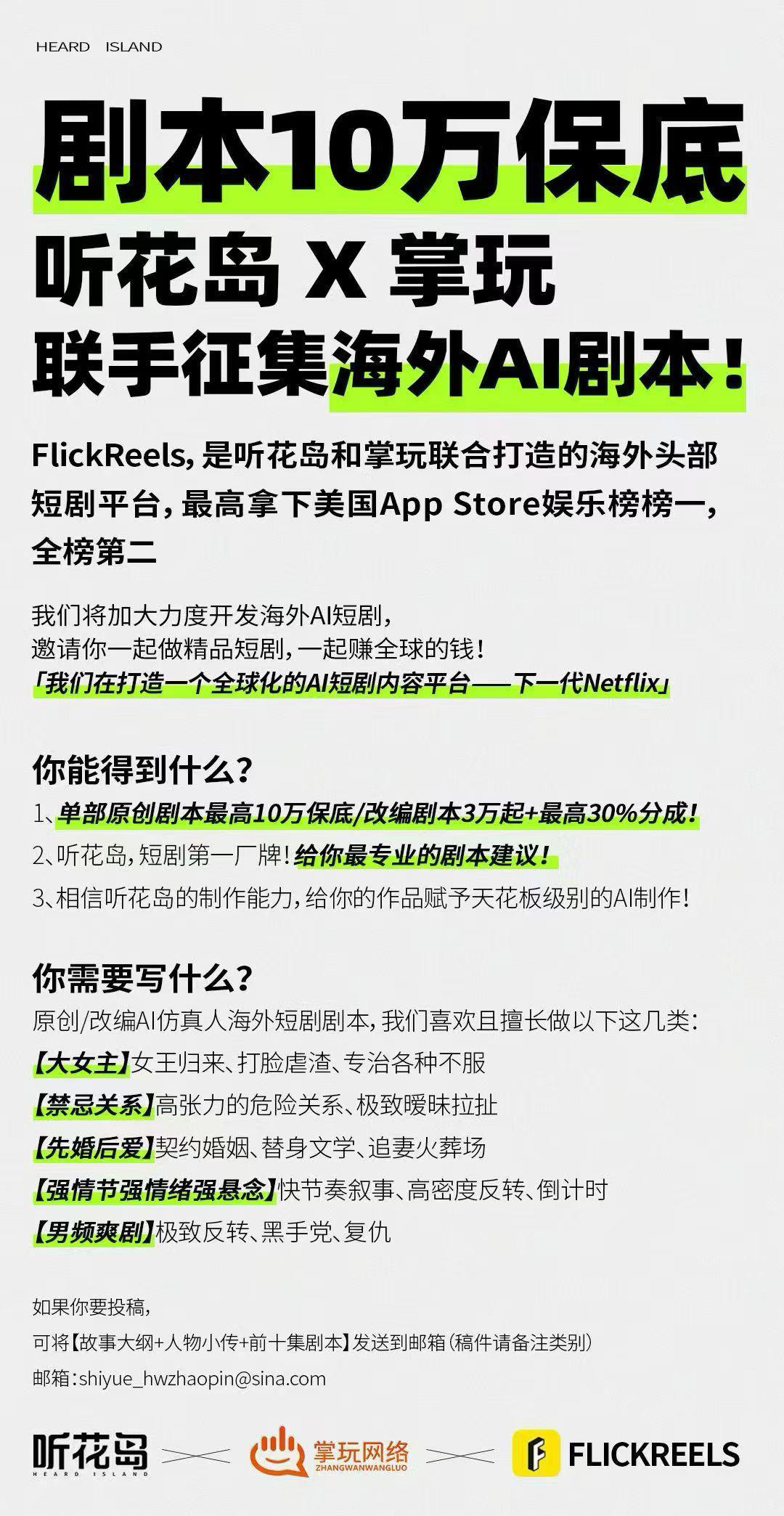 除了平台方,头部内容团队也开始杀入海外AI短剧市场。4月22日,听花岛和掌玩联手面向全球公开招募、重金收稿,这意味着双方联合开发的海外短剧平台FlickReels接下来将迈入加速爆发的新阶段,听花岛的全球化布局今年会全域加码。
